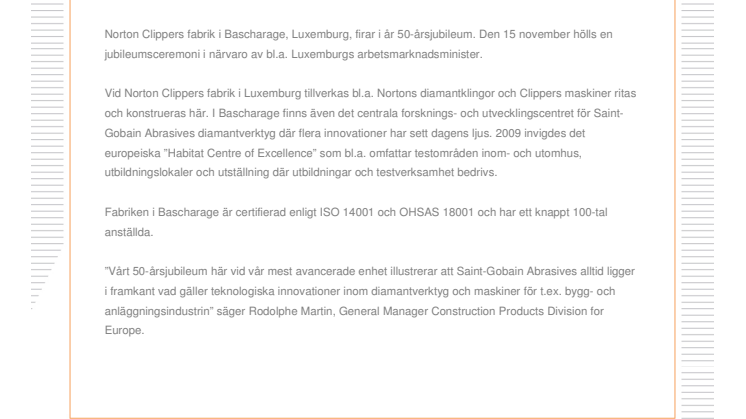”Vårt 50-årsjubileum här vid vår mest avancerade enhet illustrerar att Saint-Gobain Abrasives alltid ligger i framkant vad gäller teknologiska innovationer inom diamantverktyg och maskiner för t.ex. bygg- och anläggningsindustrin” säger Rodolphe Martin, General Manager Construction Products Division for Europe.