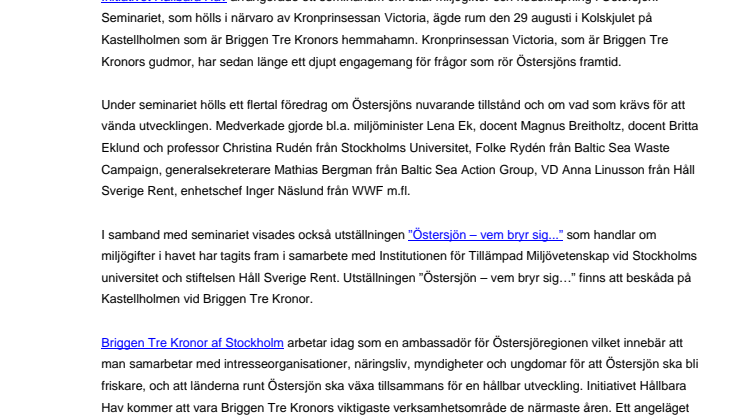 Initiativet Hållbara Hav arrangerade ett seminarium om bl.a. miljögifter och nedskräpning i Östersjön. Seminariet, som hölls i närvaro av Kronprinsessan Victoria, ägde rum den 29 augusti i Kolskjulet på Kastellholmen som är Briggen Tre Kronors hemmahamn. Kronprinsessan Victoria, som är Briggen Tre Kronors gudmor, har sedan länge ett djupt engagemang för frågor som rör Östersjöns framtid.