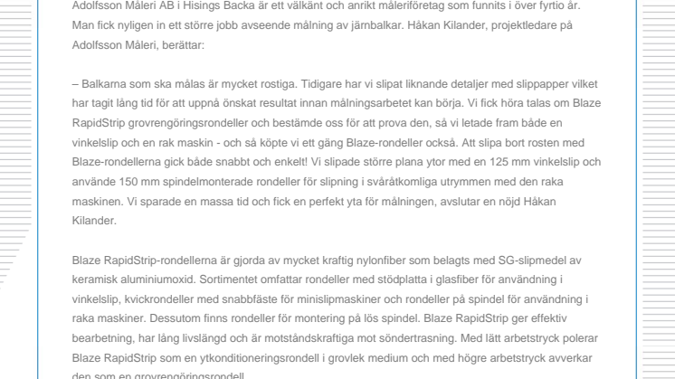 – Balkarna som ska målas är mycket rostiga. Tidigare har vi slipat liknande detaljer med slippapper vilket har tagit lång tid för att uppnå önskat resultat innan målningsarbetet kan börja. Vi fick höra talas om Blaze RapidStrip grovrengöringsrondeller och bestämde oss för att prova den, så vi letade fram både en vinkelslip och en rak maskin - och så köpte vi ett gäng Blaze-rondeller också. Att slipa bort rosten med Blaze-rondellerna gick både snabbt och enkelt! Vi slipade större plana ytor med en 125 mm vinkelslip och använde 150 mm spindelmonterade rondeller för slipning i svåråtkomliga utrymmen med den raka maskinen. Vi sparade en massa tid och fick en perfekt yta för målningen, avslutar en nöjd Håkan Kilander.