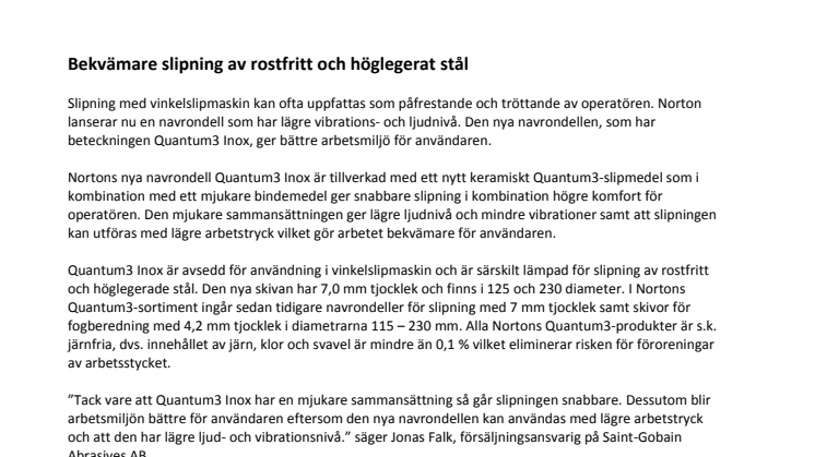 ”Tack vare att Quantum3 Inox har en mjukare sammansättning så går slipningen snabbare. Dessutom blir arbetsmiljön bättre för användaren eftersom den nya navrondellen kan användas med lägre arbetstryck och att den har lägre ljud- och vibrationsnivå.” säger Jonas Falk, försäljningsansvarig på Saint-Gobain Abrasives AB.