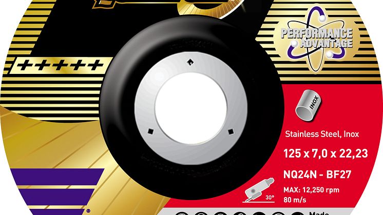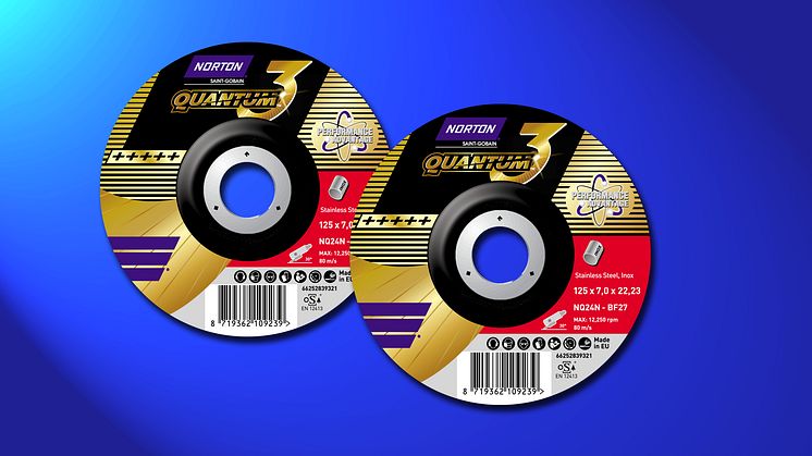Quantum3 Inox är avsedd för användning i vinkelslipmaskin och är särskilt lämpad för slipning av rostfritt och höglegerade stål. Den nya skivan har 7,0 mm tjocklek och finns i 125 och 230 diameter. I Nortons Quantum3-sortiment ingår sedan tidigare navrondeller för slipning med 7 mm tjocklek samt skivor för fogberedning med 4,2 mm tjocklek i diametrarna 115 – 230 mm. Alla Nortons Quantum3-produkter är s.k. järnfria, dvs. innehållet av järn, klor och svavel är mindre än 0,1 % vilket eliminerar risken för föroreningar av arbetsstycket.