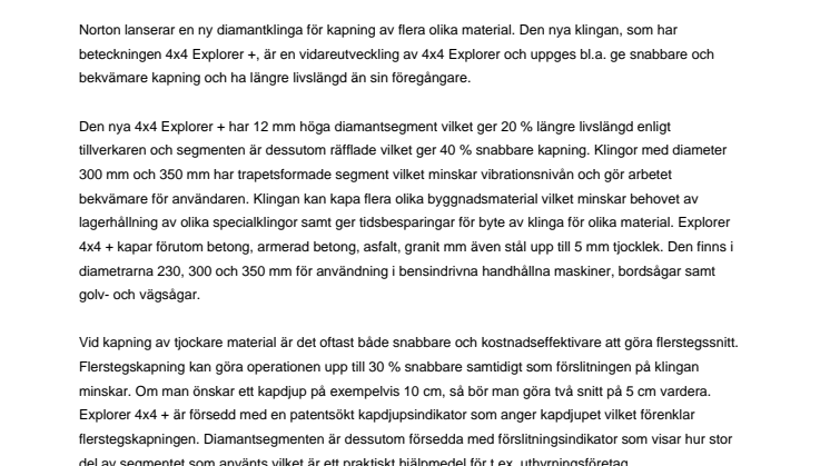 Norton lanserar en ny diamantklinga för kapning av flera olika material. Den nya klingan, som har beteckningen 4x4 Explorer +, är en vidareutveckling av 4x4 Explorer och uppges bl.a. ge snabbare och bekvämare kapning och ha längre livslängd än sin föregångare.
