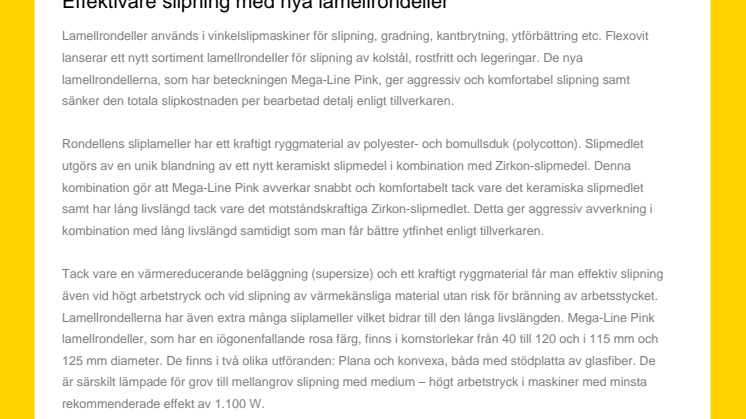 Lamellrondeller används i vinkelslipmaskiner för slipning, gradning, kantbrytning, ytförbättring etc. Flexovit lanserar ett nytt sortiment lamellrondeller för slipning av kolstål, rostfritt och legeringar. De nya lamellrondellerna, som har beteckningen Mega-Line Pink, ger aggressiv och komfortabel slipning samt sänker den totala slipkostnaden per bearbetad detalj enligt tillverkaren.