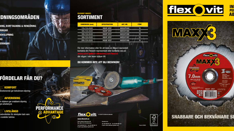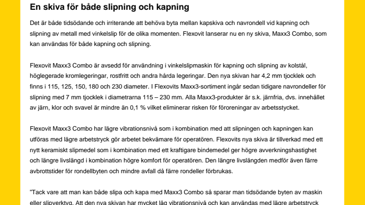 Flexovit Maxx3 Combo är avsedd för användning i vinkelslipmaskin för kapning och slipning av kolstål, höglegerade kromlegeringar, rostfritt och andra hårda legeringar. Den nya skivan har 4,2 mm tjocklek och finns i 115, 125, 150, 180 och 230 diameter. I Flexovits Maxx3-sortiment ingår sedan tidigare navrondeller för slipning med 7 mm tjocklek i diametrarna 115 – 230 mm. Alla Maxx3-produkter är s.k. järnfria, dvs. innehållet av järn, klor och svavel är mindre än 0,1 % vilket eliminerar risken för föroreningar av arbetsstycket.