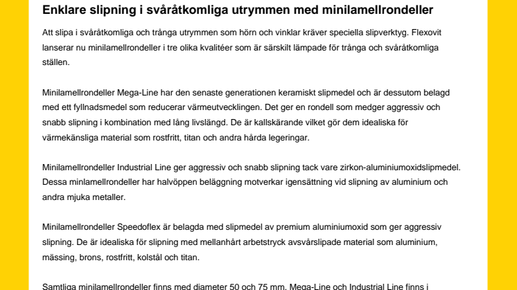 Att slipa i svåråtkomliga och trånga utrymmen som hörn och vinklar kräver speciella slipverktyg. Flexovit lanserar nu minilamellrondeller i tre olika kvalitéer som är särskilt lämpade för trånga och svåråtkomliga ställen.