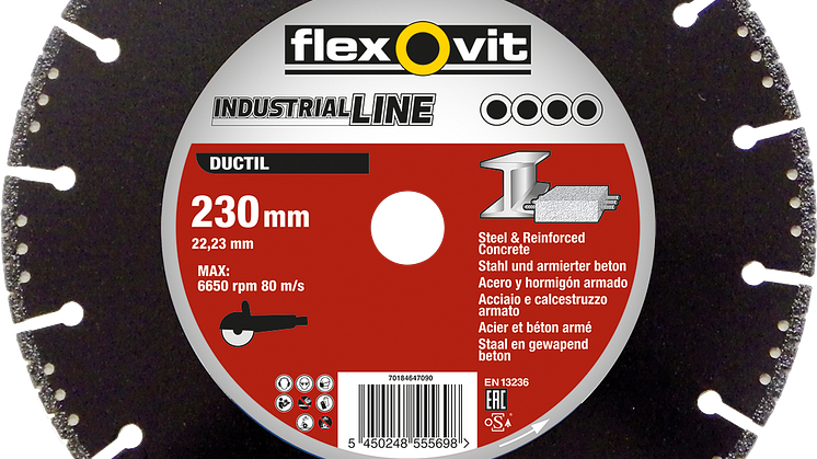 Flexovit lanserar en ny diamantklinga som kan kapa flera olika material – från gummi och armerad betong till gjutjärn. Den nya klingan, som har beteckningen Ductil, är avsedd att användas i vinkelslipmaskiner eller handhållna kapmaskiner.