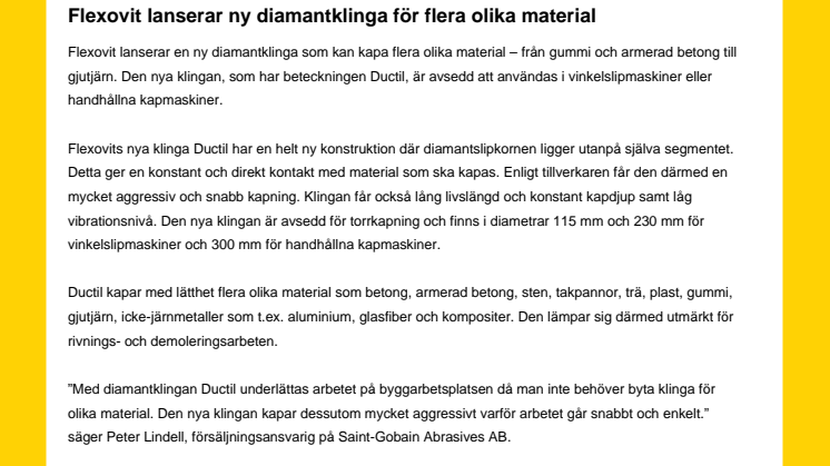 ”Med diamantklingan Ductil underlättas arbetet på byggarbetsplatsen då man inte behöver byta klinga för olika material. Den nya klingan kapar dessutom mycket aggressivt varför arbetet går snabbt och enkelt.” säger Peter Lindell, försäljningsansvarig på Saint-Gobain Abrasives AB.