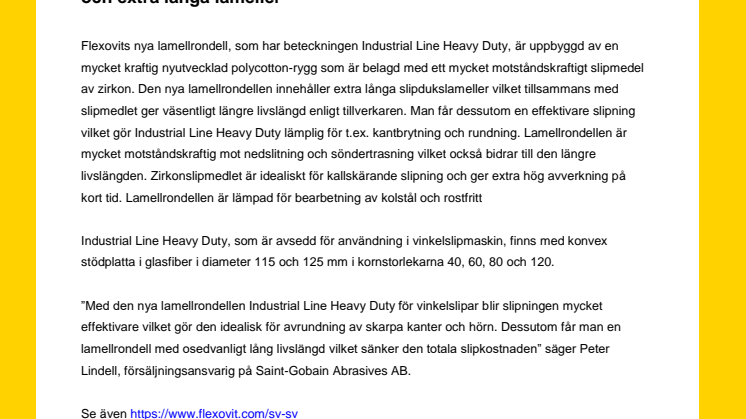 ”Med den nya lamellrondellen Industrial Line Heavy Duty för vinkelslipar blir slipningen mycket effektivare vilket gör den idealisk för avrundning av skarpa kanter och hörn. Dessutom får man en lamellrondell med osedvanligt lång livslängd vilket sänker den totala slipkostnaden” säger Peter Lindell, försäljningsansvarig på Saint-Gobain Abrasives AB.