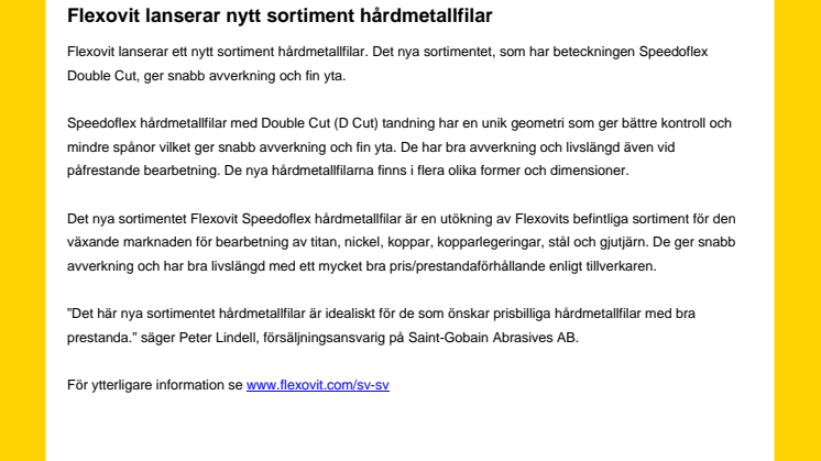 Flexovit lanserar ett nytt sortiment hårdmetallfilar. Det nya sortimentet, som har beteckningen Speedoflex Double Cut, ger snabb avverkning och fin yta.