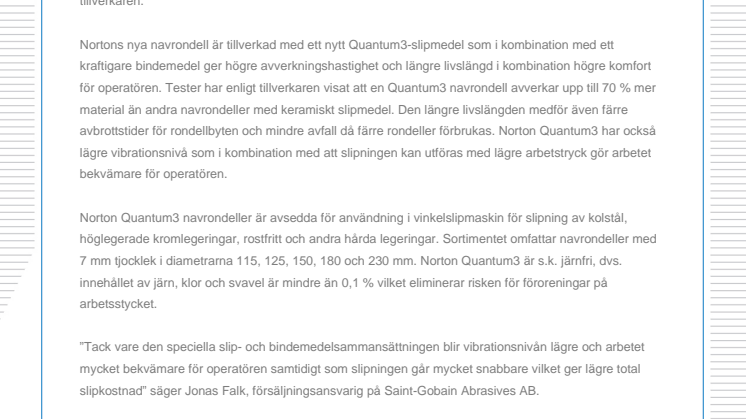 Nortons nya navrondell är tillverkad med ett nytt Quantum3-slipmedel som i kombination med ett kraftigare bindemedel ger högre avverkningshastighet och längre livslängd i kombination högre komfort för operatören. Tester har enligt tillverkaren visat att en Quantum3 navrondell avverkar upp till 70 % mer material än andra navrondeller med keramiskt slipmedel. Den längre livslängden medför även färre avbrottstider för rondellbyten och mindre avfall då färre rondeller förbrukas. Norton Quantum3 har också lägre vibrationsnivå som i kombination med att slipningen kan utföras med lägre arbetstryck gör arbetet bekvämare för operatören.