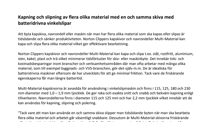 Norton Clippers kapskivor och navrondeller Multi-Material kan kapa och slipa t.ex. stål, rostfritt, aluminium, sten, kakel, plast och trä vilket minimerar tidsförluster för skiv- eller maskinbyte. Det innebär tids- och kostnadsbesparingar inom branscher och verksamhetsområden där man ofta arbetar med många olika material, som till exempel byggnads- och VVS-branschen, gör-det-själv m.m. De är idealiska för batteridrivna maskiner eftersom de har utvecklats för att ge minimal friktion. Tack vare de friskärande egenskaperna får man längre batteritid.