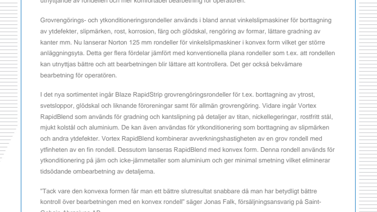 ”Tack vare den konvexa formen får man ett bättre slutresultat snabbare då man har betydligt bättre kontroll över bearbetningen med en konvex rondell” säger Jonas Falk, försäljningsansvarig på Saint-Gobain Abrasives AB.