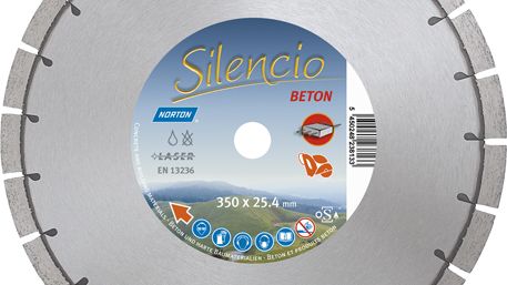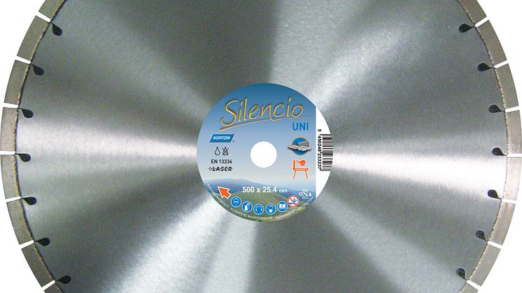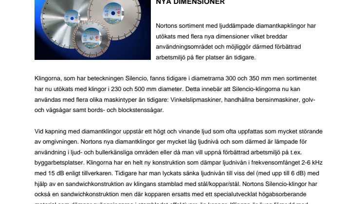 Vid kapning med diamantklingor uppstår ett högt och vinande ljud som ofta uppfattas som mycket störande av omgivningen. Nortons nya diamantklingor ger mycket låg ljudnivå och som därmed är lämpade för användning i ljud- och bullerkänsliga områden eller då man vill uppnå förbättrad arbetsmiljö på t.ex. byggarbetsplatser. Klingorna har en helt ny konstruktion som dämpar ljudnivån i frekvensomfånget 2-6 kHz med 15 dB enligt tillverkaren. Tidigare har man lyckats sänka ljudnivån till viss del (med upp till 6 dB) med hjälp av en sandwichkonstruktion av klingans stamblad med stål/koppar/stål. Nortons Silencio-klingor har också en sandwichkonstruktion men där kopparen ersatts med ett specialutvecklat högabsorberande material som dämpar svängningarna i stambladet effektivare än koppar. Klingan är även försedd med patentsökta urtag mellan segmenten som har en speciell utformning vilket gör att inga luftströmmar bildas och därmed elimineras det höga och vinande ljudet vid kapning och sågning.
