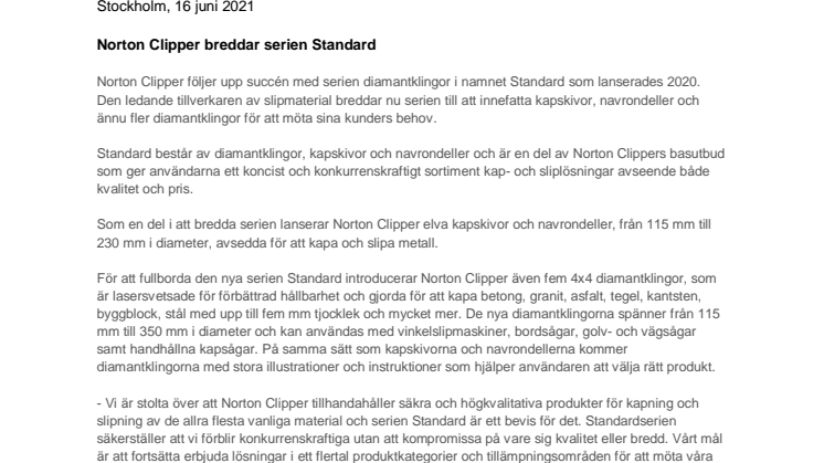 - Vi är stolta över att Norton Clipper tillhandahåller säkra och högkvalitativa produkter för kapning och slipning av de allra flesta vanliga material och serien Standard är ett bevis för det. Standardserien säkerställer att vi förblir konkurrenskraftiga utan att kompromissa på vare sig kvalitet eller bredd. Vårt mål är att fortsätta erbjuda lösningar i ett flertal produktkategorier och tillämpningsområden för att möta våra användares hela behov, säger Jonas Falk, Sales Director Distribution Markets Scandinavia på Saint-Gobain Abrasives.
