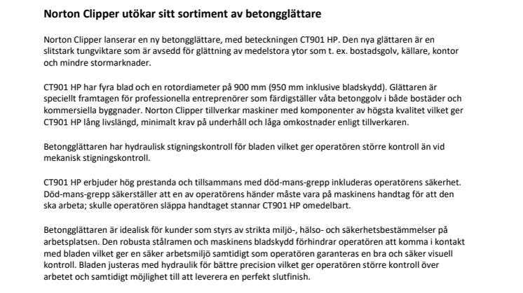 Norton Clipper lanserar en ny betongglättare med beteckningen CT901 HP. Den nya glättaren är en slitstark tungviktare som är avsedd för glättning av medelstora ytor som t. ex. bostadsgolv, källare, kontor och mindre stormarknader.