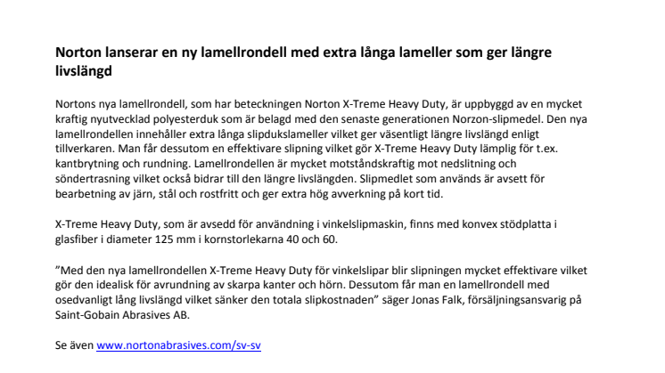 Nortons nya lamellrondell, som har beteckningen Norton X-Treme Heavy Duty, är uppbyggd av en mycket kraftig nyutvecklad polyesterduk som är belagd med den senaste generationen Norzon-slipmedel. Den nya lamellrondellen innehåller extra långa slipdukslameller vilket ger väsentligt längre livslängd enligt tillverkaren. Man får dessutom en effektivare slipning vilket gör X-Treme Heavy Duty lämplig för t.ex. kantbrytning och rundning. Lamellrondellen är mycket motståndskraftig mot nedslitning och söndertrasning vilket också bidrar till den längre livslängden. Slipmedlet som används är avsett för bearbetning av järn, stål och rostfritt och ger extra hög avverkning på kort tid.