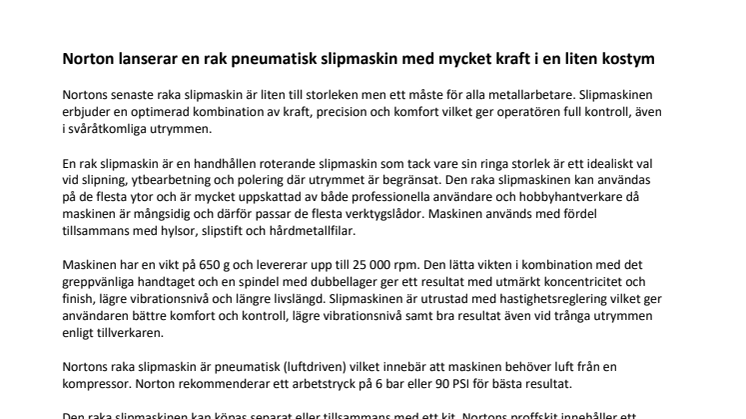 Nortons senaste raka slipmaskin är liten till storleken men ett måste för alla metallarbetare. Slipmaskinen erbjuder en optimerad kombination av kraft, precision och komfort vilket ger operatören full kontroll, även i svåråtkomliga utrymmen.