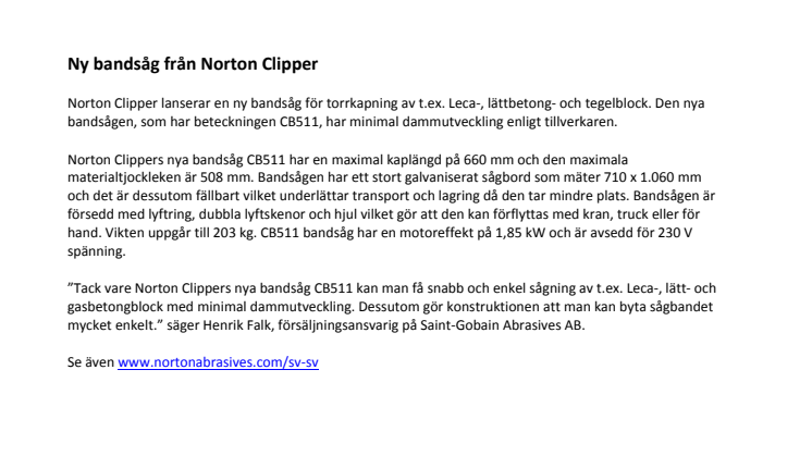 ”Tack vare Norton Clippers nya bandsåg CB511 kan man få snabb och enkel sågning av t.ex. Leca-, lätt- och gasbetongblock med minimal dammutveckling. Dessutom gör konstruktionen att man kan byta sågbandet mycket enkelt.” säger Henrik Falk, försäljningsansvarig på Saint-Gobain Abrasives AB.