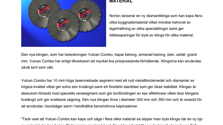 Norton lanserar en ny diamantklinga som kan kapa flera olika byggnadsmaterial vilket minskar behovet av lagerhållning av olika specialklingor samt ger tidsbesparingar för byte av klinga för olika material. Den nya klingan, som har beteckningen Vulcan Combo, kapar betong, armerad betong, sten, asfalt, granit mm. Vulcan Combo har enligt tillverkaren ett mycket bra pris/prestanda-förhållande. Klingorna kan användas såväl torrt som vått.