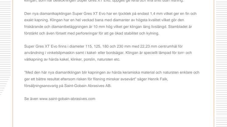 ”Med den här nya diamantklingan blir kapningen av hårda keramiska material och natursten enklare och ger ett bättre resultat eftersom risken för flisning minskar avsevärt” säger Henrik Falk, försäljningsansvarig på Saint-Gobain Abrasives AB.