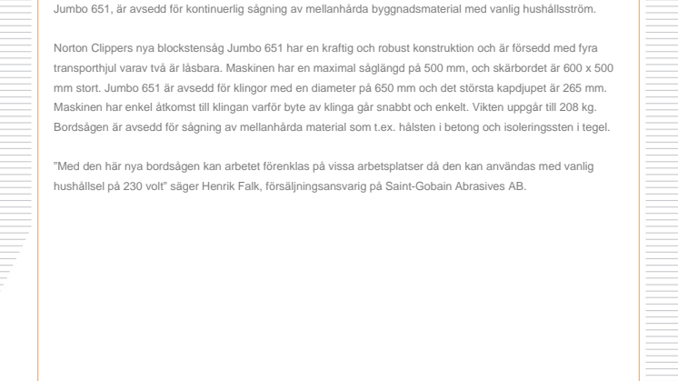 Norton Clipper lanserar en ny elektrisk blockstensåg för 230 V. Den nya blockstensågen, som har beteckningen Jumbo 651, är avsedd för kontinuerlig sågning av mellanhårda byggnadsmaterial med vanlig hushållsström.