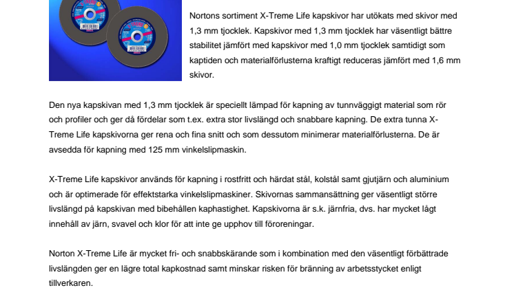 Nortons sortiment X-Treme Life kapskivor har utökats med skivor med 1,3 mm tjocklek. Kapskivor med 1,3 mm tjocklek har väsentligt bättre stabilitet jämfört med kapskivor med 1,0 mm tjocklek samtidigt som kaptiden och materialförlusterna kraftigt reduceras jämfört med 1,6 mm skivor.