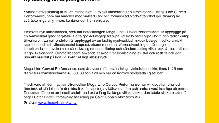 ”Tack vare att den nya lamellrondellen Mega-Line Curved Performance har vinklade lameller och förminskad stödplatta är den idealisk för slipning av kälsvets, hörn och andra svåråtkomliga utrymmen. Dessutom får man en lamellrondell med extra lång livslängd vilket sänker den totala slipkostnaden.” säger Peter Lindell, försäljningsansvarig på Saint-Gobain Abrasives AB.