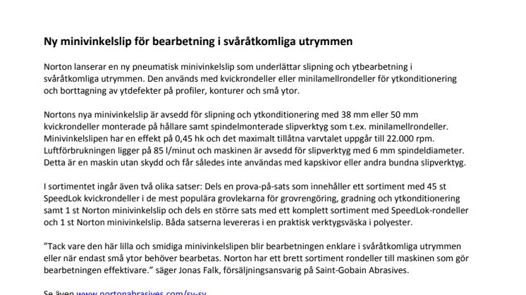 ”Tack vare den här lilla och smidiga minivinkelslipen blir bearbetningen enklare i svåråtkomliga utrymmen eller när endast små ytor behöver bearbetas. Norton har ett brett sortiment rondeller till maskinen som gör bearbetningen effektivare.” säger Jonas Falk, försäljningsansvarig på Saint-Gobain Abrasives.