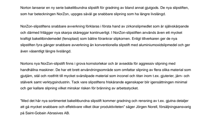 Norton lanserar en ny serie bakelitbundna slipstift för gradning av bland annat gjutgods. De nya slipstiften, som har beteckningen NorZon, uppges såväl ge snabbare slipning som ha längre livslängd.