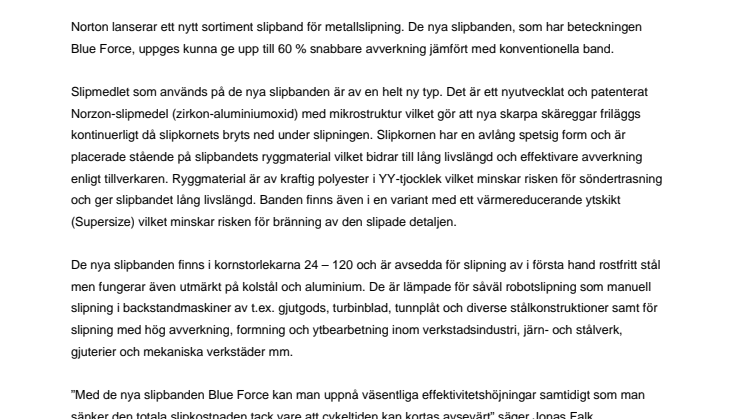 Norton lanserar ett nytt sortiment slipband för metallslipning. De nya slipbanden, som har beteckningen Blue Force, uppges kunna ge upp till 60 % snabbare avverkning jämfört med konventionella band.