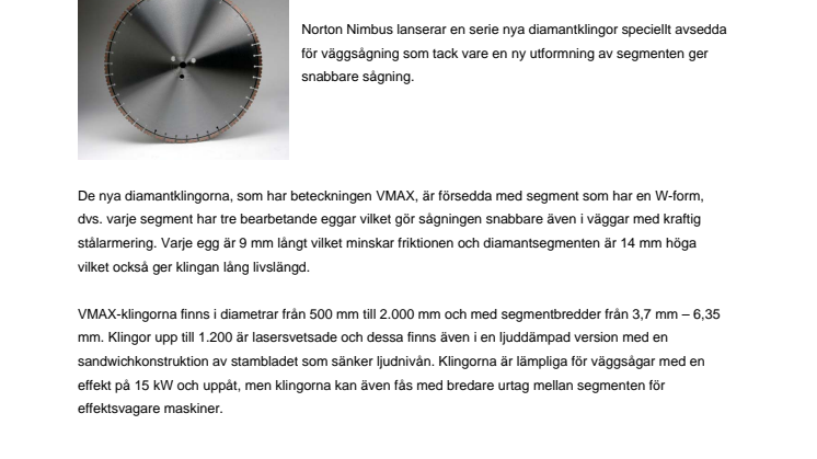 Norton Nimbus lanserar en serie nya diamantklingor speciellt avsedda för väggsågning som tack vare en ny utformning av segmenten ger snabbare sågning.