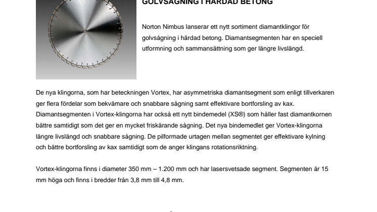 Norton Nimbus lanserar ett nytt sortiment diamantklingor för golvsågning i härdad betong. Diamantsegmenten har en speciell utformning och sammansättning som ger längre livslängd.