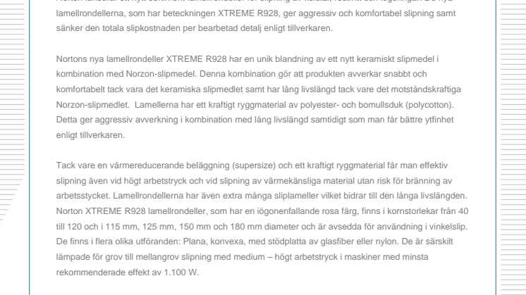 Nortons nya lamellrondeller XTREME R928 har en unik blandning av ett nytt keramiskt slipmedel i kombination med Norzon-slipmedel. Denna kombination gör att produkten avverkar snabbt och komfortabelt tack vara det keramiska slipmedlet samt har lång livslängd tack vare det motståndskraftiga Norzon-slipmedlet. Lamellerna har ett kraftigt ryggmaterial av polyester- och bomullsduk (polycotton). Detta ger aggressiv avverkning i kombination med lång livslängd samtidigt som man får bättre ytfinhet enligt tillverkaren.