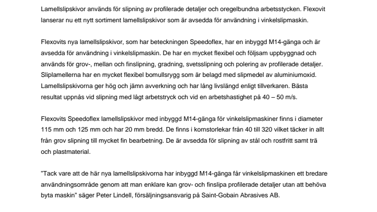 Flexovits nya lamellslipskivor, som har beteckningen Speedoflex, har en inbyggd M14-gänga och är avsedda för användning i vinkelslipmaskin. De har en mycket flexibel och följsam uppbyggnad och används för grov-, mellan och finslipning, gradning, svetsslipning och polering av profilerade detaljer. Sliplamellerna har en mycket flexibel bomullsrygg som är belagd med slipmedel av aluminiumoxid. Lamellslipskivorna ger hög och jämn avverkning och har lång livslängd enligt tillverkaren. Bästa resultat uppnås vid slipning med lågt arbetstryck och vid en arbetshastighet på 40 – 50 m/s.