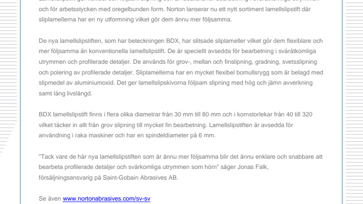 Lamellslipstift ger flexibel och följsam slipning och är idealiska för bearbetning i svåråtkomliga utrymmen och för arbetsstycken med oregelbunden form. Norton lanserar nu ett nytt sortiment lamellslipstift där sliplamellerna har en ny utformning vilket gör dem ännu mer följsamma.