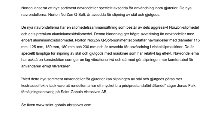 ”Med detta nya sortiment navrondeller för gjuterier kan slipningen av stål och gjutgods göras mer kostnadseffektiv tack vare att rondellerna har ett mycket bra pris/prestandaförhållande” säger Jonas Falk, försäljningsansvarig på Saint-Gobain Abrasives AB.