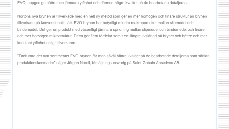 Norton lanserar ett nytt sortiment brynen för hening och polering. Det nya sortimentet, som har beteckningen EVO, uppges ge bättre och jämnare ytfinhet och därmed högre kvalitet på de bearbetade detaljerna.