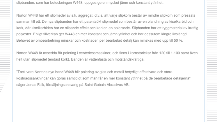 ”Tack vare Nortons nya band W448 blir polering av glas och metall betydligt effektivare och stora kostnadssänkningar kan göras samtidigt som man får en mer konstant ytfinhet på de bearbetade detaljerna” säger Jonas Falk, försäljningsansvarig på Saint-Gobain Abrasives AB.