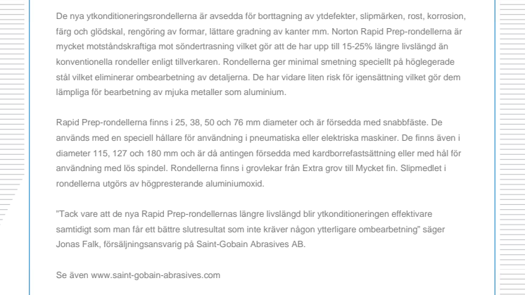 ”Tack vare att de nya Rapid Prep-rondellernas längre livslängd blir ytkonditioneringen effektivare samtidigt som man får ett bättre slutresultat som inte kräver någon ytterligare ombearbetning” säger Jonas Falk, försäljningsansvarig på Saint-Gobain Abrasives AB.