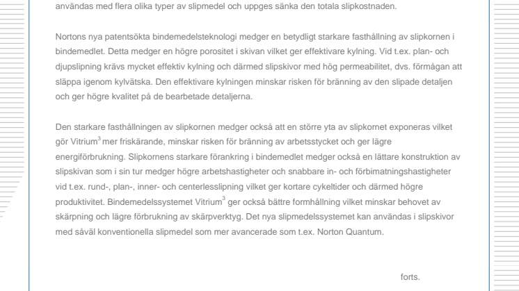 Norton lanserar ett nytt bindemedelssystem för keramiskt bundna slipskivor avsedda för precisionsslipning. Det nya patentsökta bindemedelssystemet, som har beteckningen Vitrium3, kan användas med flera olika typer av slipmedel och uppges sänka den totala slipkostnaden.