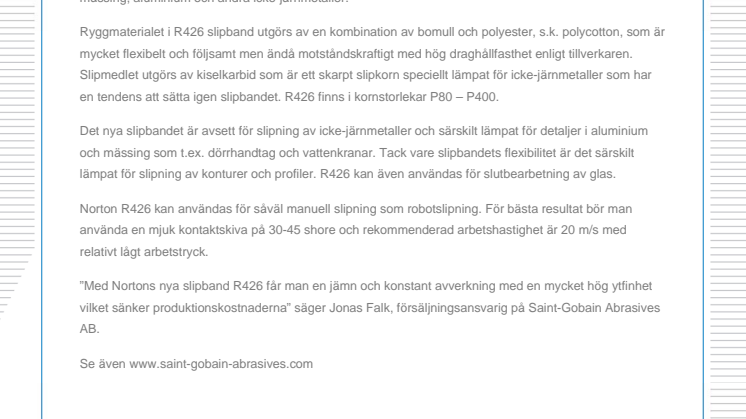 ”Med Nortons nya slipband R426 får man en jämn och konstant avverkning med en mycket hög ytfinhet vilket sänker produktionskostnaderna” säger Jonas Falk, försäljningsansvarig på Saint-Gobain Abrasives AB.