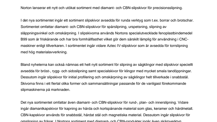 Det nya sortimentet omfattar även diamant- och CBN-slipskivor för rund-, plan- och innerslipning. Vidare ingår diamantkapskivor för kapning av hårda och kortspånande material som glas, keramer och hårdmetall. CBN-kapskivor används för snabbstål, härdat stål och magnetiska material. Dessutom ingår slipskivor för omslipning av fräsar. I Nortons sortiment med diamant- och CBN-produkter ingår även skärpverktyg, diamantpastor och diamantfilar.