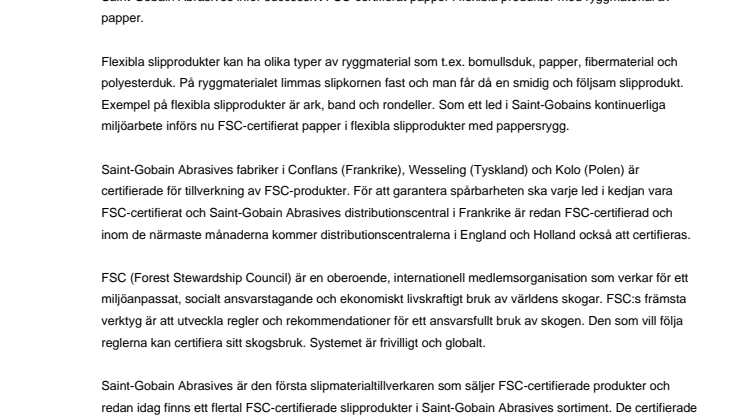 ”Inom Saint-Gobain har miljö- och säkerhetsfrågorna högsta prioritet och med införandet av FSC-certifierat papper i flera av våra flexibla slipprodukter är vi glada att kunna bidra till en bättre miljö” säger Jörgen Norell, miljö- och säkerhetsansvarig på Saint-Gobain Abrasives AB.