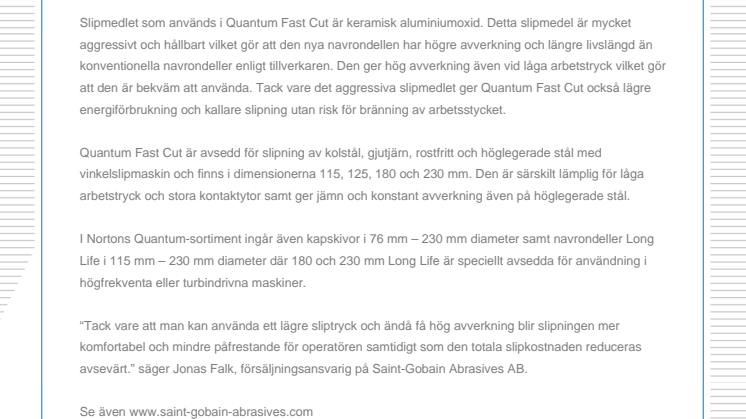 “Tack vare att man kan använda ett lägre sliptryck och ändå få hög avverkning blir slipningen mer komfortabel och mindre påfrestande för operatören samtidigt som den totala slipkostnaden reduceras avsevärt.” säger Jonas Falk, försäljningsansvarig på Saint-Gobain Abrasives AB.