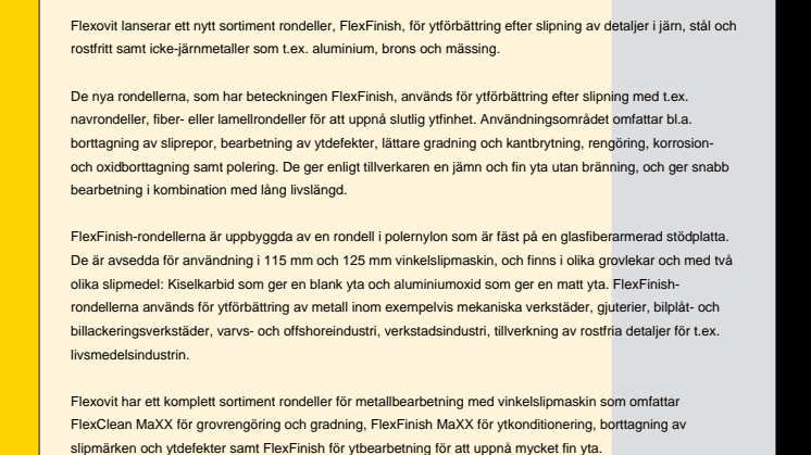 Flexovit lanserar ett nytt sortiment rondeller, FlexFinish, för ytförbättring efter slipning av detaljer i järn, stål och rostfritt samt icke-järnmetaller som t.ex. aluminium, brons och mässing.