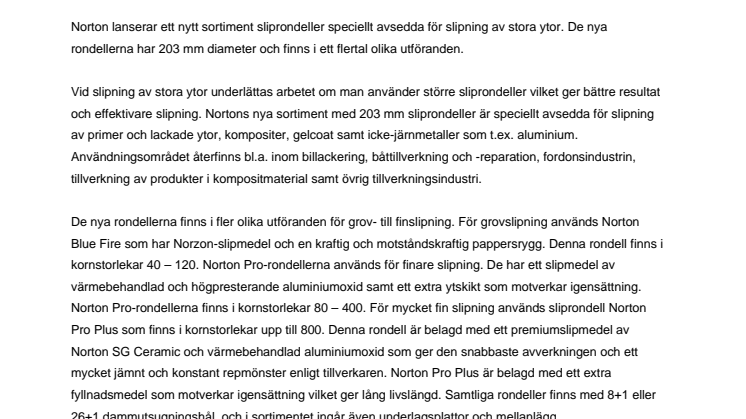 Vid slipning av stora ytor underlättas arbetet om man använder större sliprondeller vilket ger bättre resultat och effektivare slipning. Nortons nya sortiment med 203 mm sliprondeller är speciellt avsedda för slipning av primer och lackade ytor, kompositer, gelcoat samt icke-järnmetaller som t.ex. aluminium. Användningsområdet återfinns bl.a. inom billackering, båttillverkning och -reparation, fordonsindustrin, tillverkning av produkter i kompositmaterial samt övrig tillverkningsindustri.