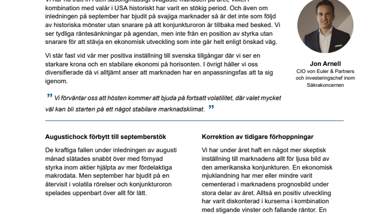 Vi har nu trätt in i den säsongmässigt svagaste månaden på året, vilket i kombination med valår i USA historiskt har varit en stökig period. Och även om inledningen på september har bjudit på svajiga marknader så är det inte som följd av historiska mönster utan snarare på att konjunkturoron är tillbaka med besked. Vi ser tydliga räntesänkningar på agendan, men inte från en position av styrka utan snarare för att stävja en ekonomisk utveckling som inte går helt enligt önskad väg.