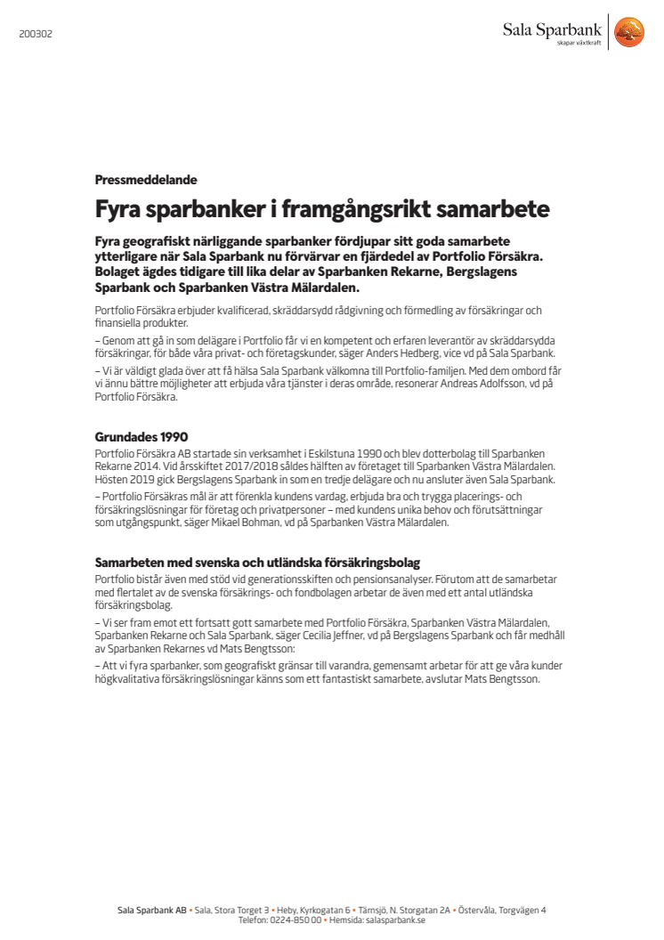 ytterligare när Sala Sparbank nu förvärvar en fjärdedel av Portfolio Försäkra.