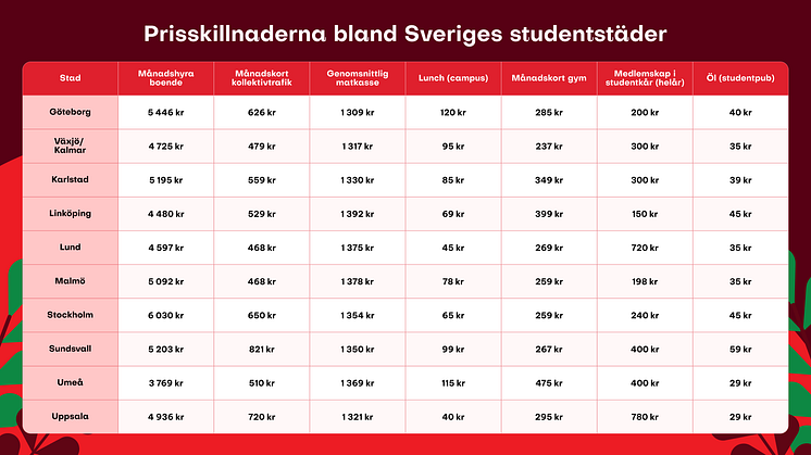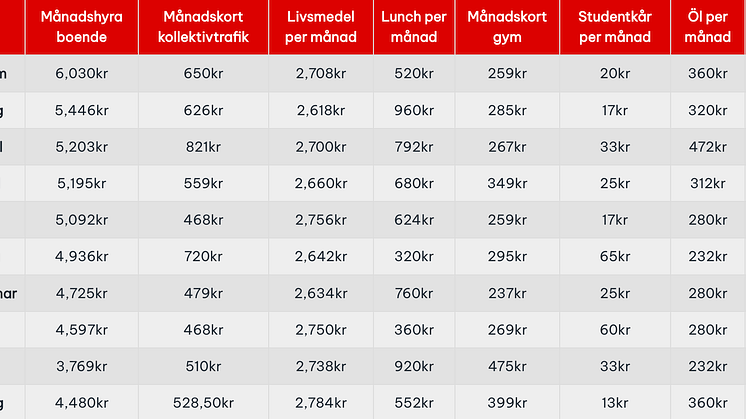 Månadskostnader – här är dyraste och billigaste studentstaden