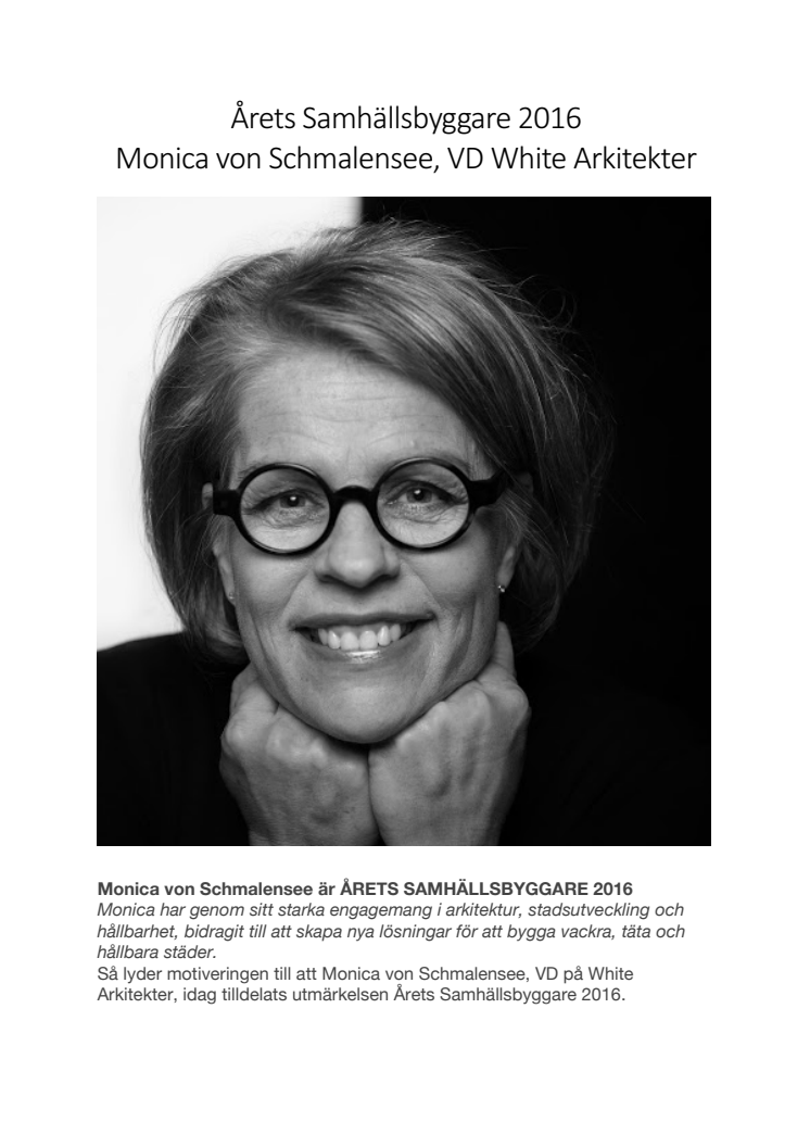 Årets Samhällsbyggare 2016 är Monica von Schmalensee, VD White Arkitekter!